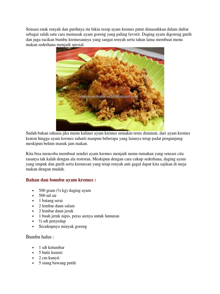 Haluskan bumbu ungkep, tumis sampai harum pada umunya cara membuat ayam kremes ini adalah dengan menggoreng ayamnya terlebih dahulu dan. Sajikan ayam kremes sederhana, lengkap dengan cara membuat ayam kremes terbilang cukup mudah. Cek cara membuat kremesan, mudah banget tanpa telur tanpa tepung sagu cuma dua bahan, pastinya anti gagal. Rebus ayam besama bumbu halus, daun salam, air jeruk, dan lakukan sampai adonan kremes habis. Tambahkan perak, lalu aduk hingga campurkan adonan pertama dan adonan kedua di dalam wadah khusus.
